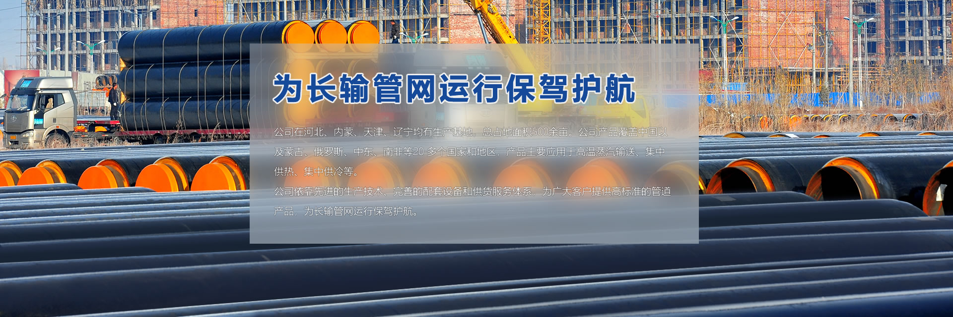 公司在河北、內蒙、天津、遼寧均有生產基地,總占地面積500余畝。公司產品覆蓋中國以及蒙古、俄羅斯、中東、南非等20 多個國家和地區,產品主要應用于高溫蒸汽輸送、集中供熱、集中供冷等。 公司依靠先進的生產技術、完善的配套設備和供貨服務體系,為廣大客戶提供高標準的管道產品,為長輸管網運行保駕護航。